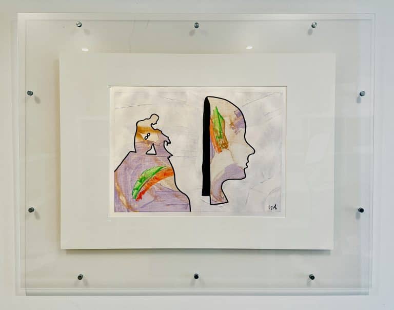 Rechts die klare Silhouette eines Kopfes, es ist die Maske des Alltags, hinter der Menschen ihre wahren Gefühle verbergen. Sie wirkt ruhig und funktional, gefasst. Es ist das Bild nach außen, das Rollenbild, das funktioniert, selbst wenn im Inneren Spannungen und Ängste toben.